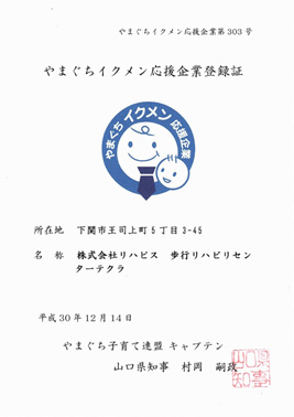 県では、男性はもとより、職場の上司、同僚等を含めた、男性が育児参加しやすい雇用環境づくりに取り組む企業を奨励・支援し、その取組を広く紹介するため、(「やまぐちイクメン応援企業」宣言制度)を実施しています。